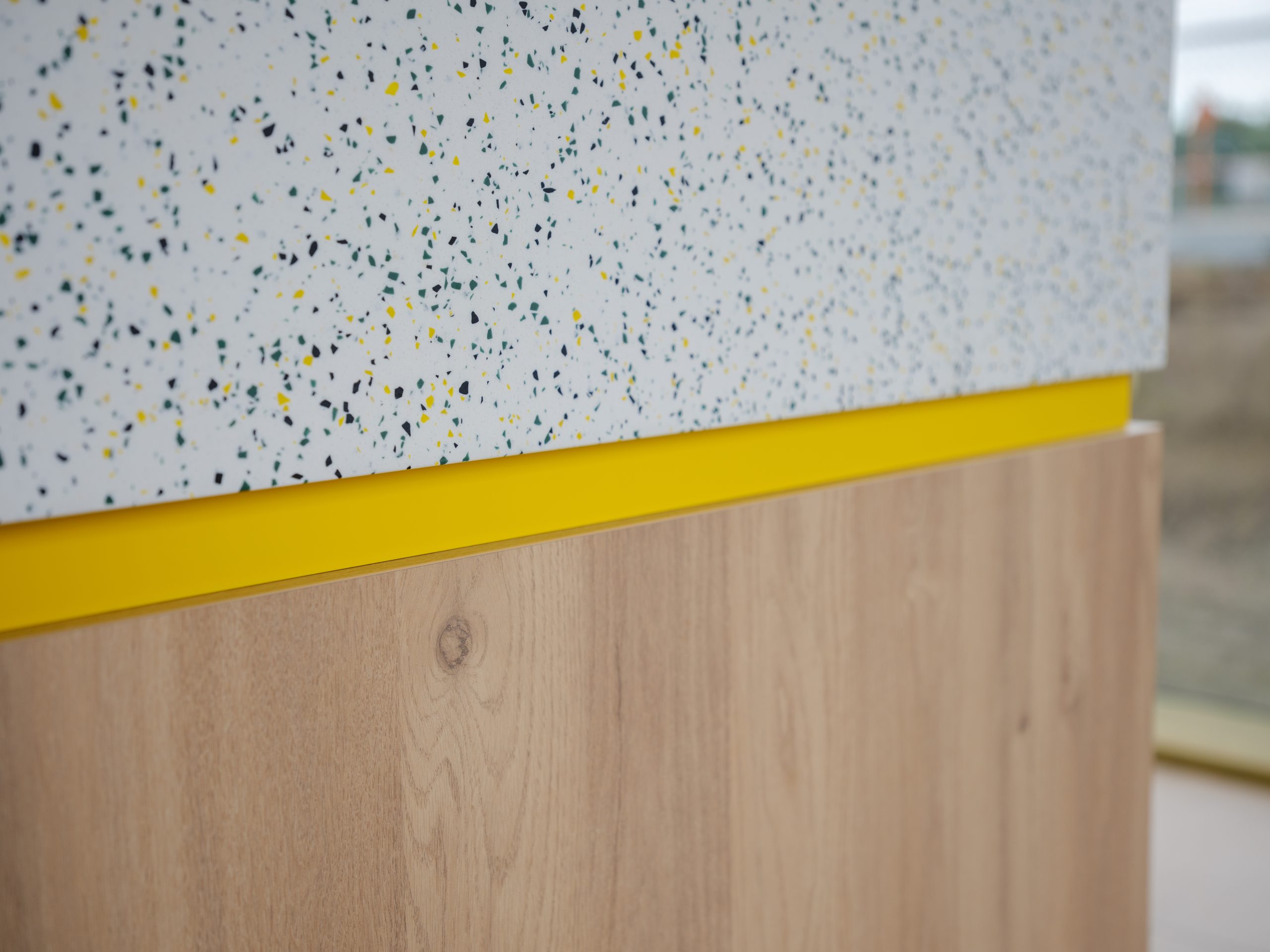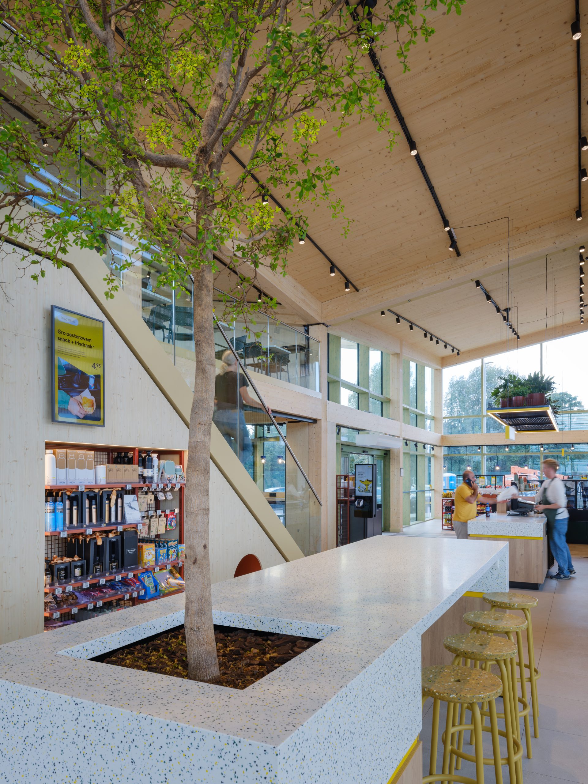 Für das Interieur und die Theken wurde das Solid-Surface-Material der niederländischen Marke Marlan gewählt. In Zusammenarbeit mit Pyrasied wurde für Fastned eine einzigartige Farbkombination entwickelt. Das Material, das an Theken, Empfangsbereichen und in den sanitären Einrichtungen eingesetzt wurde, sollte sowohl ästhetisch als auch funktional sein. Es entstand ein vollständig maßgeschneidertes Design in den charakteristischen Farben von Fastned: Gelb, Grün und Schwarz.