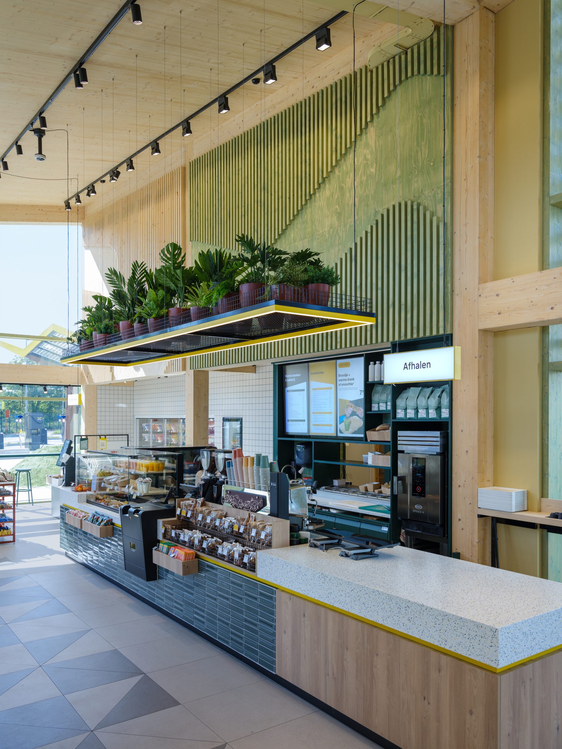 Die Ladestation sollte nicht nur praktisch sein, sondern Besucher einladen, das Auto kurz stehen zu lassen. Mit gesunden Sandwiches und Salaten, frischem Kaffee und Smoothies. Mit einem Lounge-Bereich und ausreichend Arbeitsplätzen.