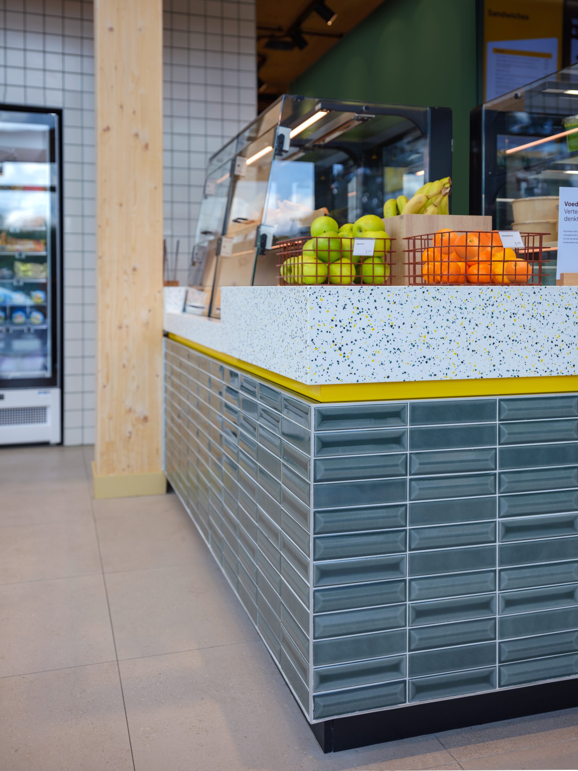 For the interior and the counters, the solid surface material from the Dutch brand Marlan was chosen. In collaboration with Pyrasied, a unique colour combination was developed for Fastned. The material, used in counters, reception areas, and sanitary facilities, needed to be both aesthetically pleasing and functional. A fully custom-made design was created in Fastned’s signature colors: yellow, green, and black.