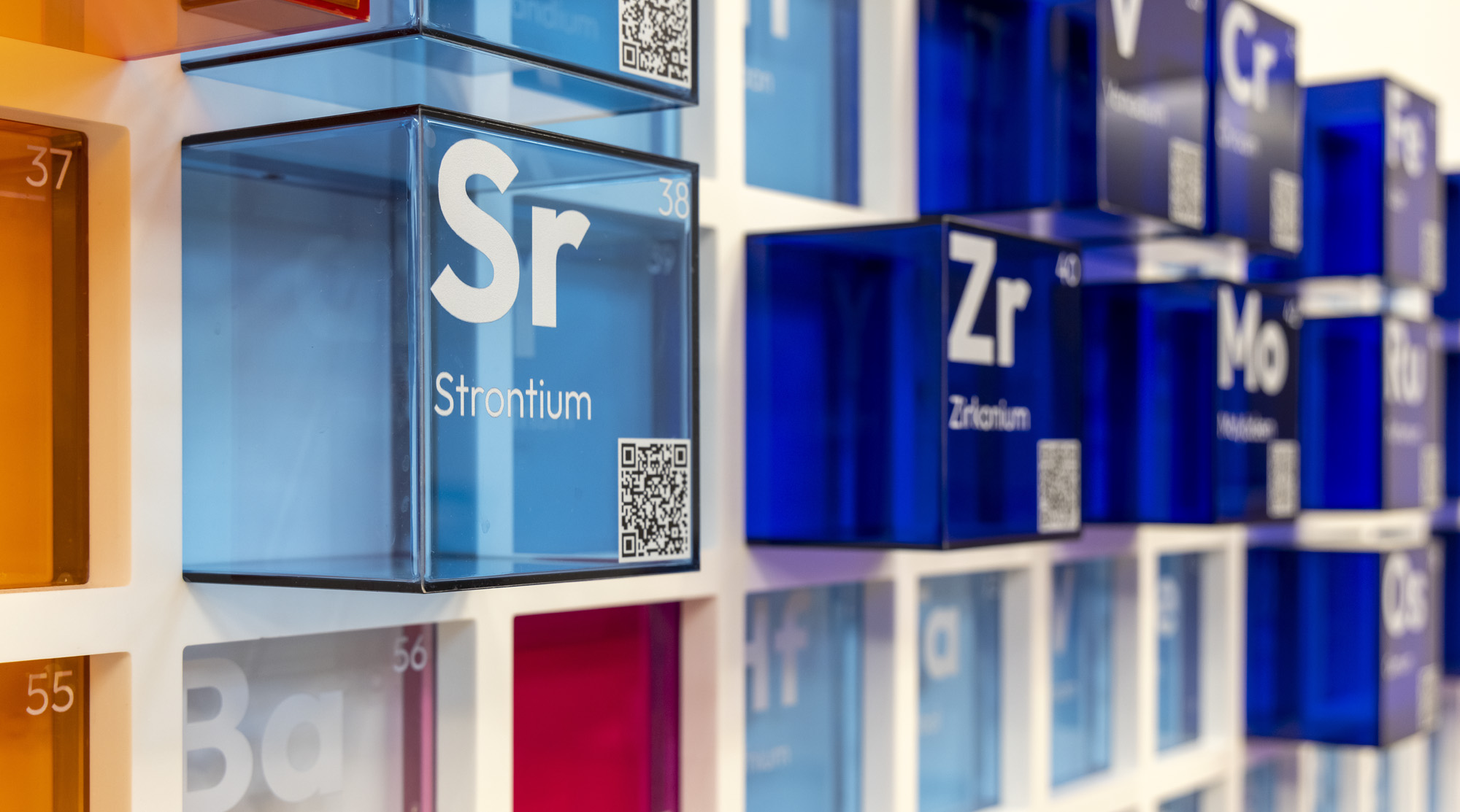 The design combines functionality with educational and visually appealing features, such as custom tables in the shape of kidneys, a liver, and the DNA counter with red accents. The periodic table plays a prominent role in the canteen and training room. A large board with coloured cubes, inspired by the colours and structure of the periodic system, stands there. “QR codes are integrated into the board; when scanned, they provide additional information about the composition of medications and other details,” Marianne explains.