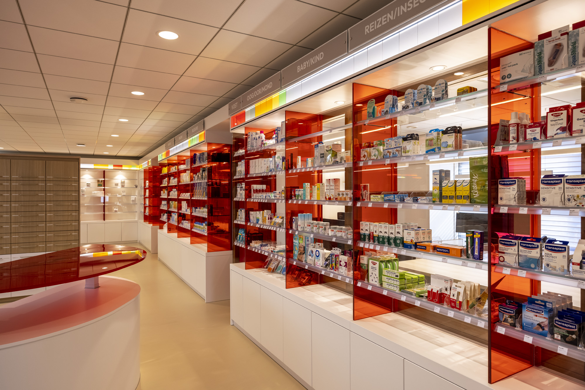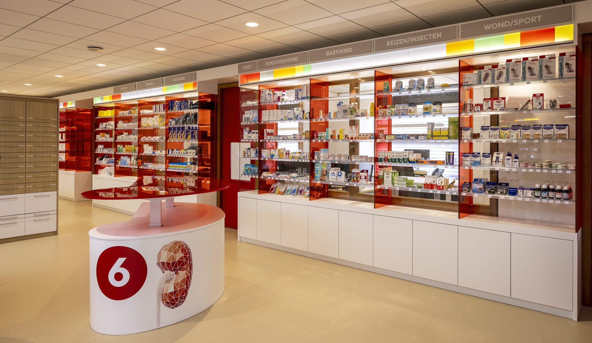 The result is a pharmacy that is both functional and inspiring. The space appears light, open, and transparent, making patients feel welcome while maintaining a clear overview. The custom-made counters and furniture are designed with attention to ergonomics and ease of use, allowing employees to work comfortably and efficiently. Sustainable materials are combined with innovative uses of colour, giving the interior a modern yet warm and inviting atmosphere. Educational elements, such as the periodic table and other thematic details, are subtly woven into the design, enhancing the medical character of the pharmacy.