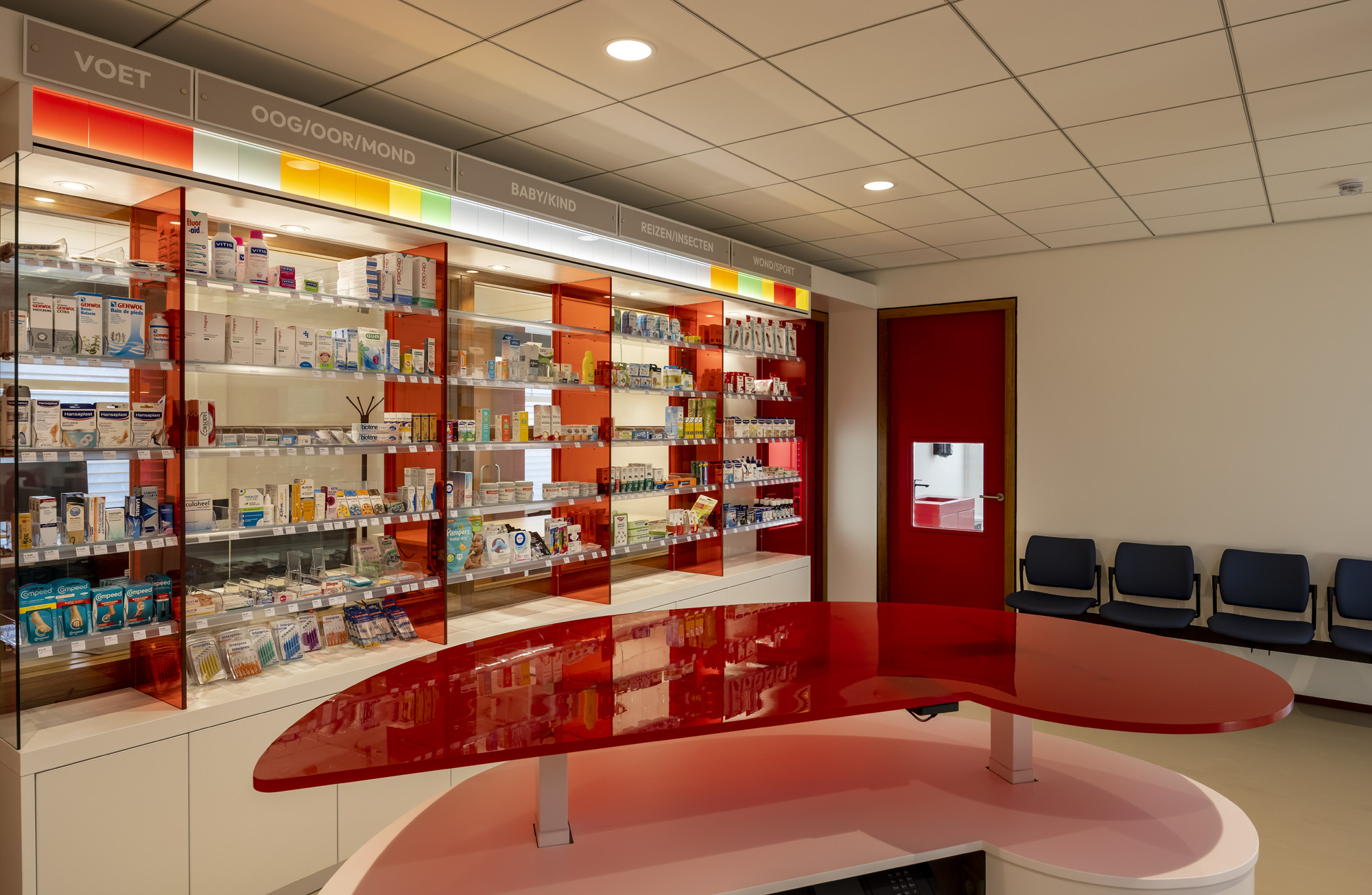 A real eye-catcher are the custom-made counters in striking Cranberry Red. Seen from above, their shape subtly refers to a liver and kidneys: a nod to the medical character of the pharmacy.