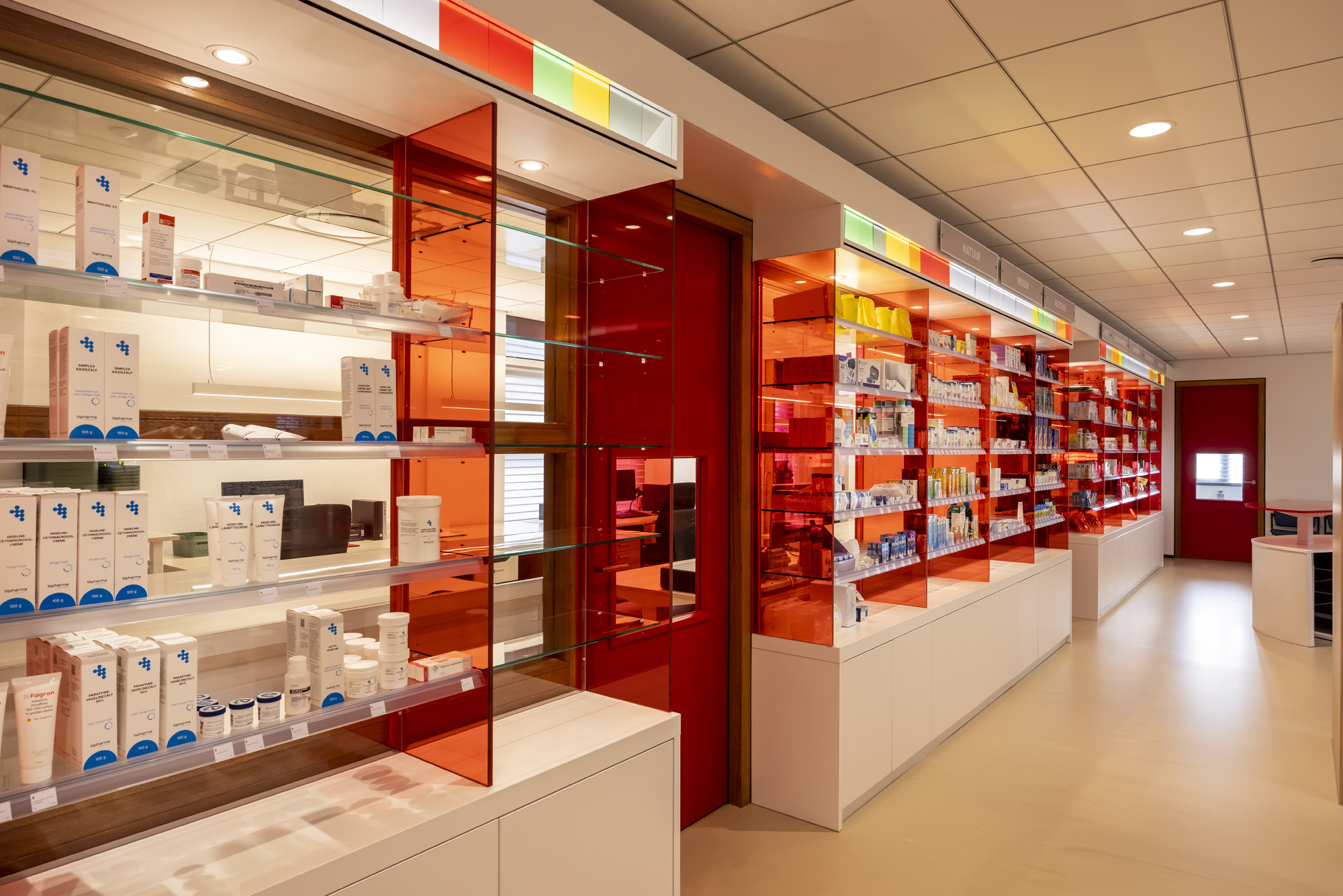 Another absolute eye-catcher is the illuminated cove, built from coloured panels inspired by the stained-glass details of the second Ommen location. This subtle reference creates a visual connection between both locations and gives the new pharmacy a recognisable and atmospheric accent.