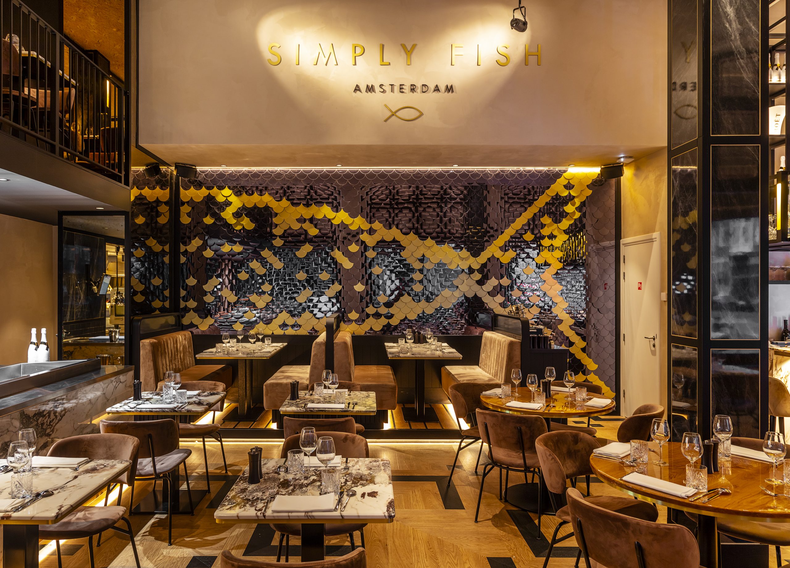 Interieurarchitect Glenn Kop van Woodfever kwam met sfeervolle art-deco elementen. Licht, marmer én een prachtig wanddecor zorgt voor een warme en stijlvolle sfeer in het interieur. De wandbekleding is gemaakt van honderden kleine schubben van spiegelacrylaat in de vorm van een vis.