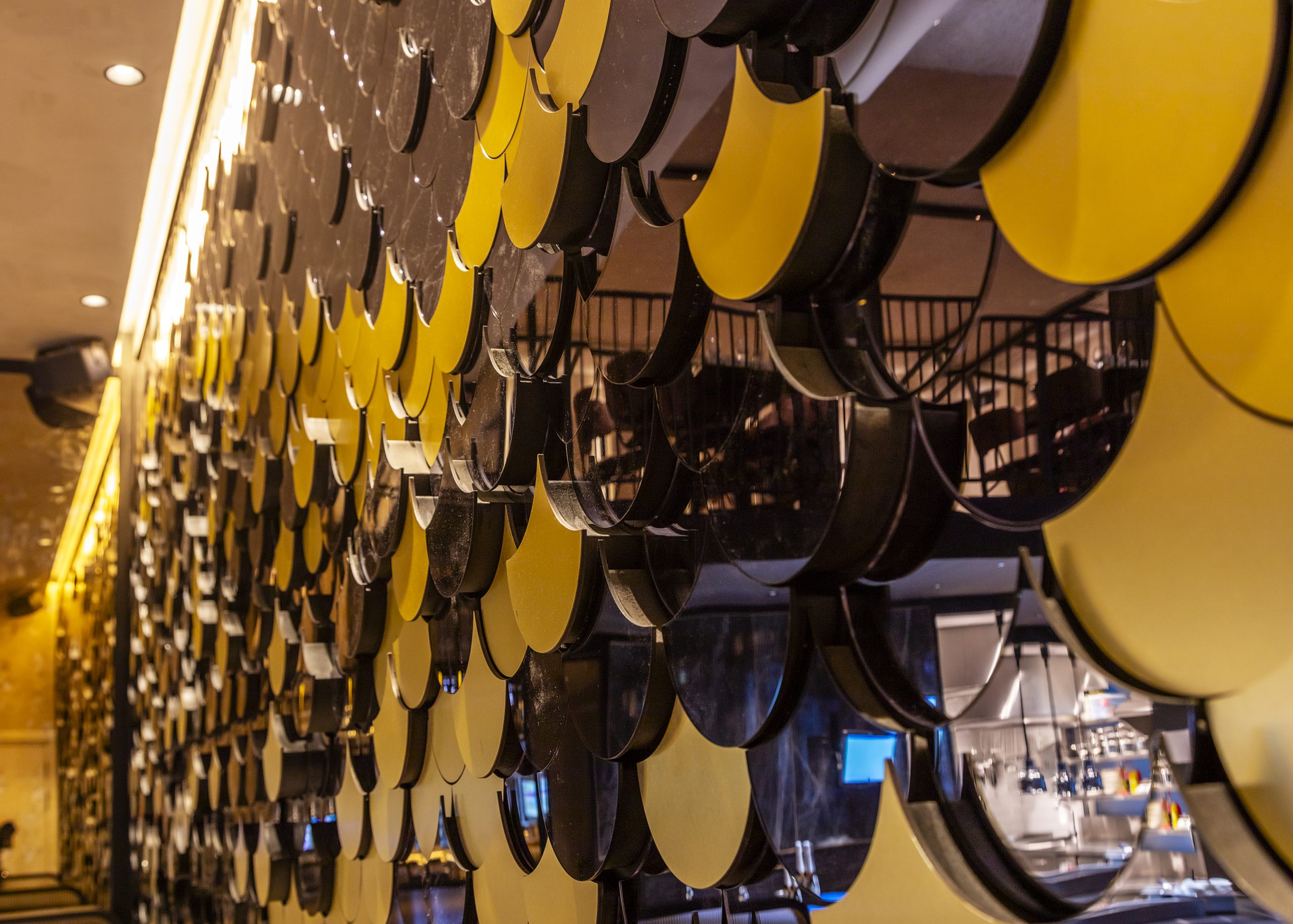 De gouden acrylaat schubben vormen de omtrek van de vis. De schubben van antraciet vullen aan. De schubben zijn niet onder elkaar geplaatst, maar overlappen met elkaar voor extra diepte effect. Het was een behoorlijke klus om de schubben op deze manier vast te zetten, maar het is interieurbouwer Woodfever gelukt.
